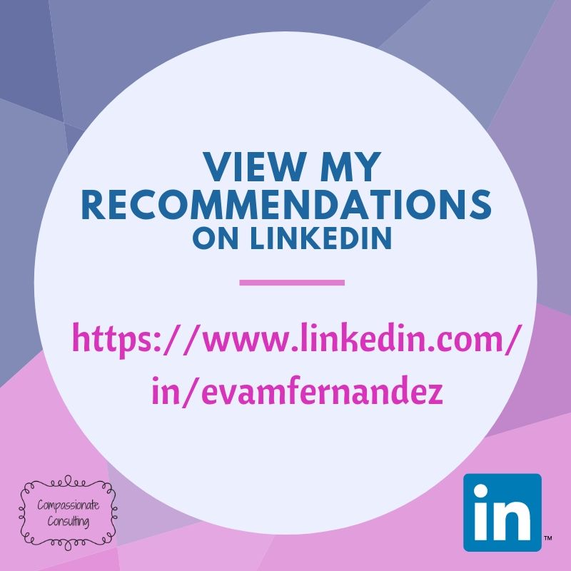 Eva was helpful when I needed to revamp my resume, cover letter and LinkedIn profile. I had over 20 years experience and needed a refresh. She was on point, patient, provided helpful information and tips. I had problems accessing her documents on my new MacBook for my deadline and she immediately went into problem solving mode. She was worried for me. (So sweet!) She went over and above to assist me. I found Eva on a FB page of Latinas because I was looking for a POC and/or Latina to hire. She was responsive, detailed, experienced and insightful. Eva is fabulous and hope to meet her in person one day! =========================================================================== Eva is an amazing local San Antonio leader and minority business owner serving in the professional development space. Ask her about her killer resume templates. They are highly effective! Resume building is a process that can benefit from a third person perspective. When I decided to seek out assistance from a resume writer, I found myself searching for a good fit via LinkedIn. What I appreciated working with Eva is having a consultation meeting before moving forward with revamping my resume. I appreciated seeing her creative product and feel confident to put my resume out there to be considered for school leadership positions. =========================================================================== I had wanted to update my resume for quite sometime. Not knowing who to use, or having any insight, I went on linked in and asked for suggestion. Eva offered her services. I found her easy to work with, very helpful, easy to reach when I needed her. She wanted to make sure everything I needed was prepared for me quickly (I chose to pay the extra fee to have it done quicker). She did a beautiful job. I chose my template, and reviewed my needs. Very pleasant to work with. Finished product was perfect, and I have already had reach outs. Thank you Eva. =========================================================================== Eva was wonderful to work with! she was extremely patient with me as well, when my resume needs had changed over the time she was consulting me. I am extremely pleased with the final resume - the layout looks so professional! I would highly recommend Compassionate Consulting for your resume writing or job seeking needs. The name says everything!! =========================================================================== This woman Eva M Fernandez did a amazing job on my resume!!!...with in minutes my resume was looked at and a job offers we’re coming in...She’s the real deal. Eva was very professional, and was able to get my resume done in a timely manner. Great communication the entire time! Real new to LinkedIn... was absolutely lost on where to even begin try’n to put all this together. I started noticing the Advisors on here who you could work with & I literally just looked @8-9 of them & picked the one with the most positive reviews. Definitely see why Ms.Fernandez had such high reviews. We spoke briefly a week or so prior & I had just kinda put it in the back burner. Out of know where I get an email from a CEO of a real major major company in my field. I called Ms.Fernandez & said “Ok, I’m ready to hire you & get it done...but I need it tomorrow”😳 Needless to say the deadline was made & interview is scheduled. =========================================================================== Eva did an excellent job updating my resume. I enjoyed being able to go back and forth with her on revisions to my resume and being able to give my feedback on what I thought necessary or could be removed. I was thoroughly impressed with how my resume came out and I would definitely come back to her for any changes I needed on my resume. I highly recommend her services as she is professional, courteous, open minded, and keeps you involved in the process! Thanks again, Eva!! =========================================================================== If you are in need of some help brushing up your LinkedIn profile or bringing your resume current, I would highly recommend Eva Fernandez and her business "Compassionate Consulting". She did an amazing job. Thank you for every Thing Eva. Eva did a masterful job of helping with my resume and LinkedIn profile. She was professional, thorough, and kind, and I am overjoyed with the results I received. I have recommended her services to numerous friends and colleagues and have nothing but great things to say about the experience! =========================================================================== To my fellow LinkedIn family, I wanted to take time out to give a "Nation Wide Recommendation", to a small business named "Compassionate Consulting," this is a one shop stop with true compassion and expertise in all that they offer. I had the pleasure of utilizing their resume writing and LinkedIn presence services. Initially, I was just trying to get a raise from my employer but after meeting the owner, Eva Fernandez, I was inspired to do much more at a fraction of the cost. She was a triple threat to larger companies in the way of professionalism, knowledge and compassion! Thank you Eva!! All the best. =========================================================================== I worked with Eva for my coaching on networking skills, interviewing tips and certifications to better my career journey. Eva is very knowledgeable and has great career insights for today’s competitive world. She was very quick at providing me right resources and always following up on progress. I would recommend Eva and Compassionate Consulting to everyone =========================================================================== I worked with Eva for my coaching on networking skills, interviewing tips and certifications to better my career journey. Eva is very knowledgeable and has great career insights for today’s competitive world. She was very quick at providing me right res